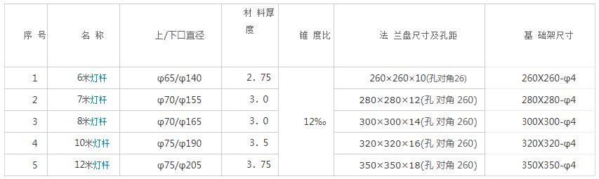 1、燈桿高度3-16米,主桿由大型折彎機壓制成形,壁厚2.5-6mm,具體外觀及 尺寸根據(jù)用戶要求定制。